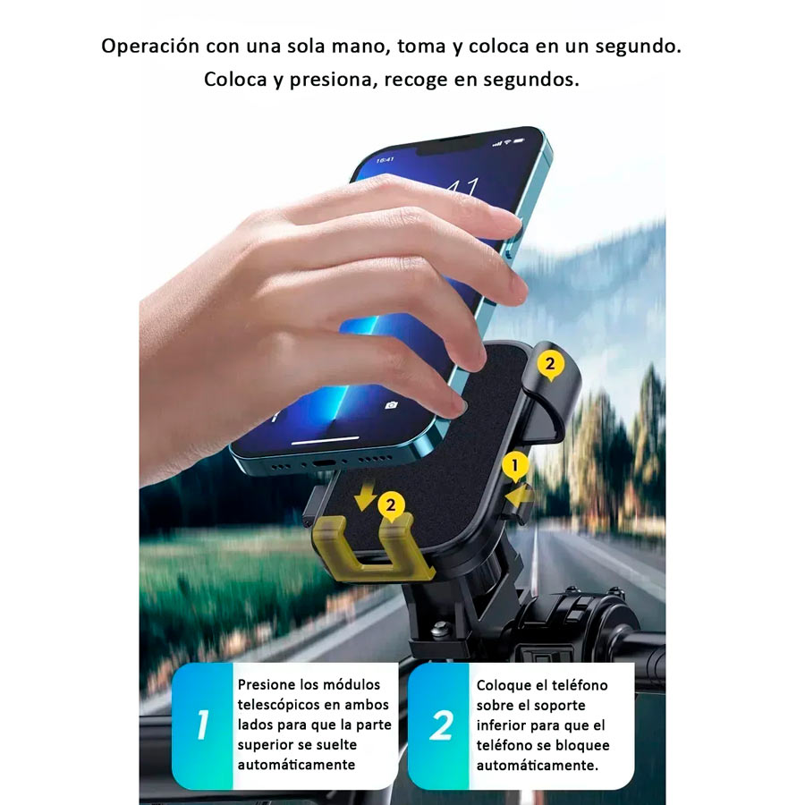 Además, cuenta con un botón de liberación rápida, que permite colocar o retirar el teléfono en apenas 1 segundo y con una sola mano, lo que resulta especialmente práctico mientras se usa. De este modo, se mejora la seguridad y se reduce la distracción durante la conducción.